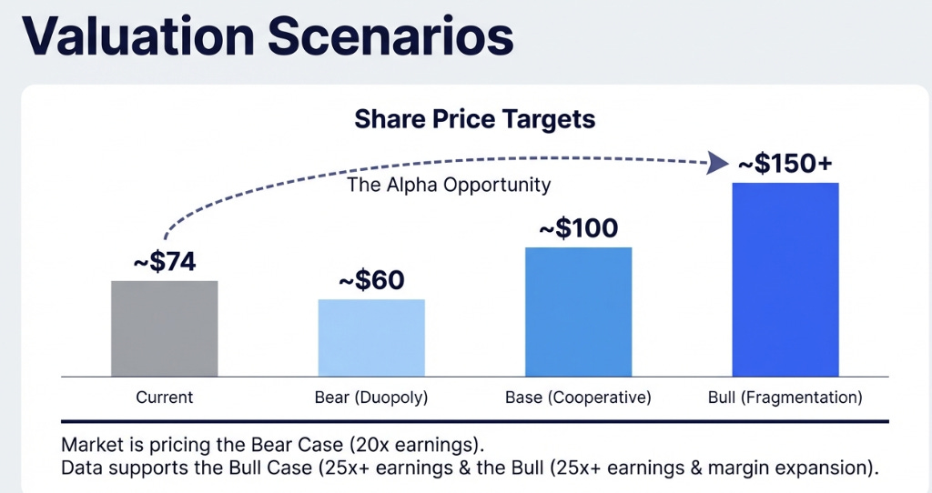 The market appears to be pricing something closer to duopoly. We believe fragmentation is most likely. The gap is the opportunity.