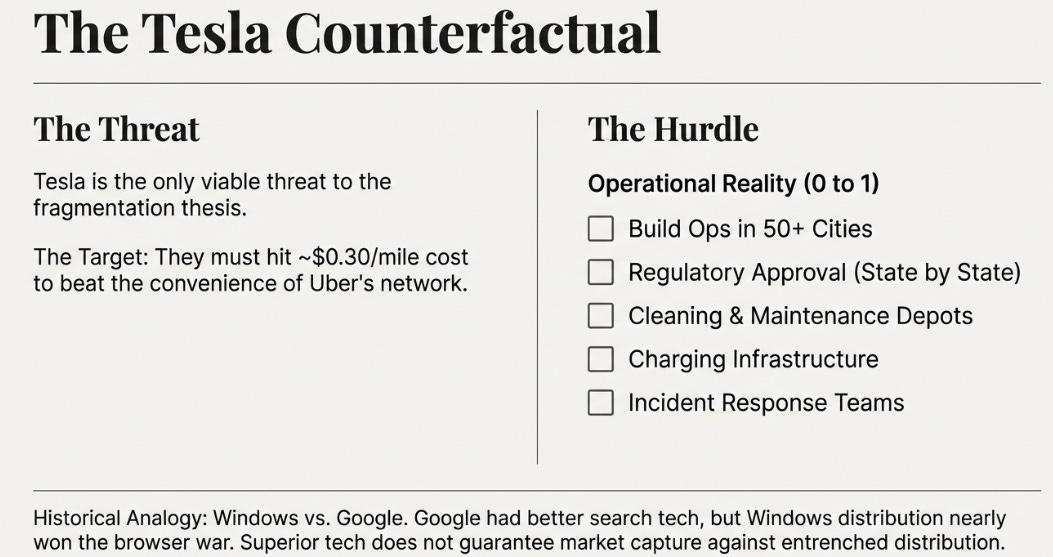 Tesla is the strongest challenge to this thesis. They’re currently operating 50-100 vehicles in Austin at a $4.20 flat fare, roughly half the cost of a typical Uber ride. If Tesla can deliver sustainable unit economics at that price point while scaling to tens of thousands of vehicles across major cities, the coordination layer advantage becomes irrelevant. Users will simply accept slightly longer wait times to pay half the price.