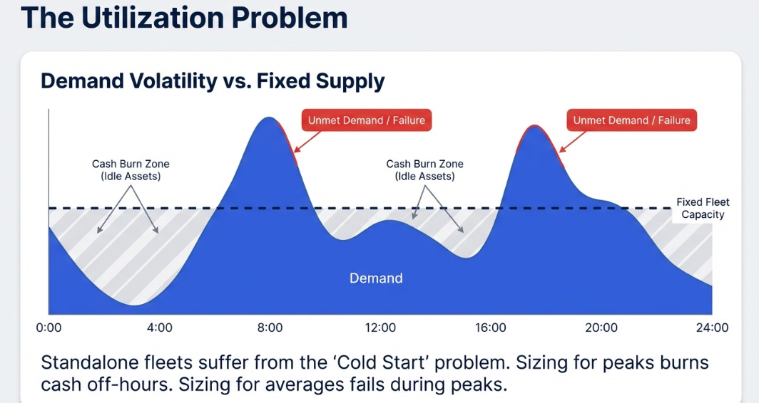 But the deeper point is about the resource constraint. In human ride-hailing, the constraint was driver supply, getting enough people to turn on the app. In autonomous mobility, the constraint is demand aggregation, ensuring expensive capital assets stay productively occupied.