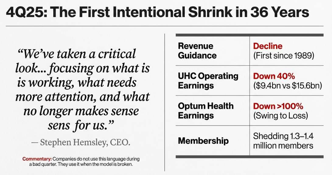 And then there was the headline that mattered more than any earnings-per-share figure: UnitedHealth guided revenue to decline in 2026. This will be the first annual revenue contraction since 1989, thirty-six years of uninterrupted growth, ended.