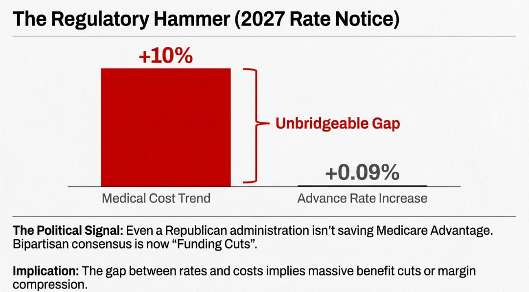 The advance notice proposed a 0.09% increase in Medicare Advantage payment rates for 2027. Wall Street had expected 4-6%. This single data point killed the political rescue thesis that many bulls had been counting on.