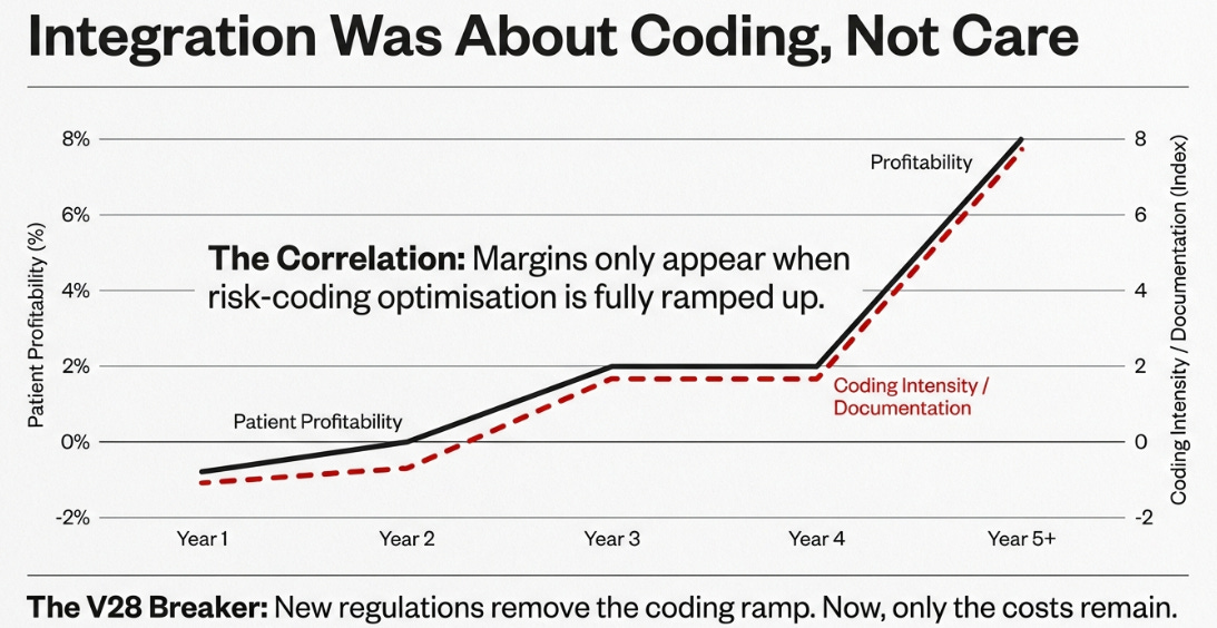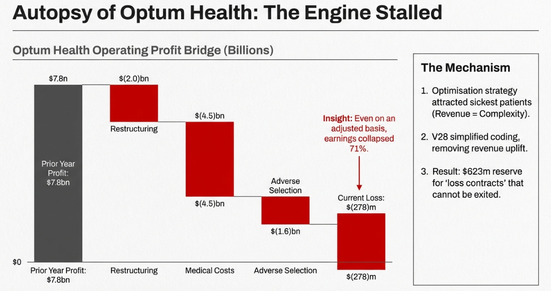 The company also disclosed a $623 million reserve for “loss contracts”, agreements that management described as “structurally unprofitable” and that they “could not exit for 2026.” This is adverse selection made explicit. The optimization strategy attracted the sickest patients because complexity generated revenue. Under V28’s simplified coding rules, those patients still require expensive care, but the revenue uplift is gone.