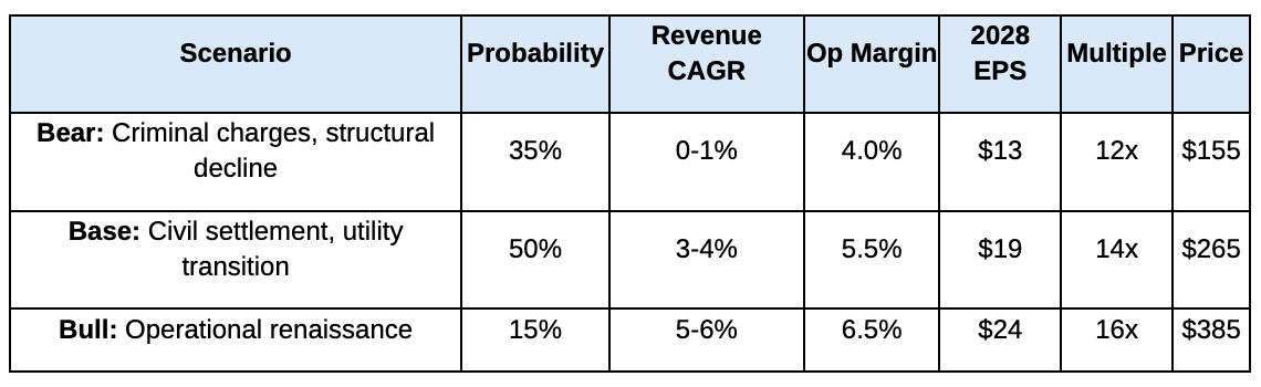 H1 2026: DOJ resolution. Criminal charges push firmly into bear territory. Civil settlement in the $8-12 billion range enables base case stabilization.