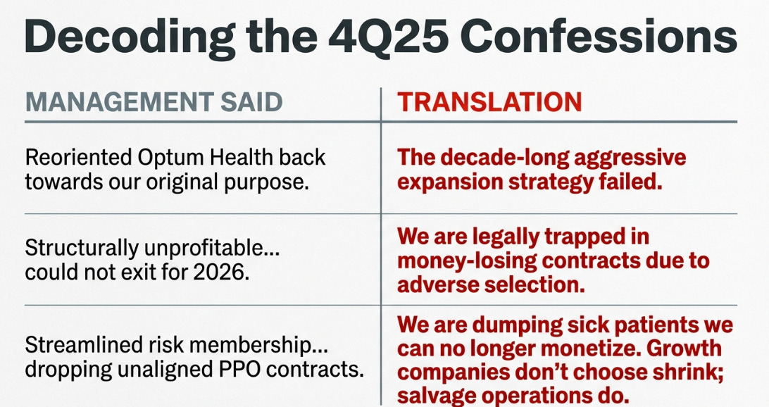 Read that sentence carefully. “Structurally unprofitable” means the losses aren’t from execution problems that better management can fix. They’re baked into the contract terms. “Could not exit” means UnitedHealth is trapped, legally obligated to continue losing money on these arrangements through at least 2026. This is the adverse selection problem I identified in my 3Q piece, now quantified and reserved against.