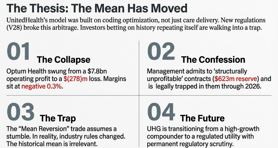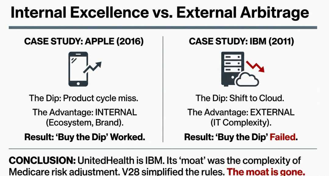 UnitedHealth’s situation maps more closely to IBM than Apple. The company’s extraordinary historical margins weren’t solely the product of operational excellence. They were partly the product of regulatory complexity, specifically, a Medicare risk adjustment system that rewarded sophisticated documentation. V28 simplified that system. The regulatory mean has moved, and UnitedHealth’s financial mean is moving with it.
