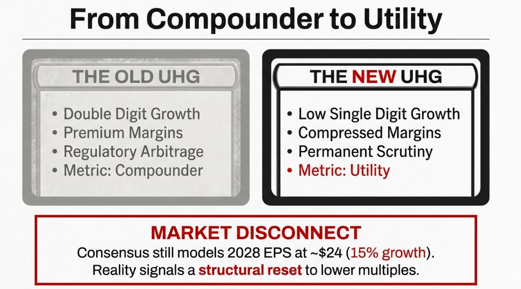 My variant perception is simpler. UnitedHealth will stabilize. It will likely return to modest growth eventually. But the destination is not the premium compounder of 2010-2023. The destination is a utility: lower margins, lower growth, a lower multiple, and permanently elevated regulatory scrutiny.