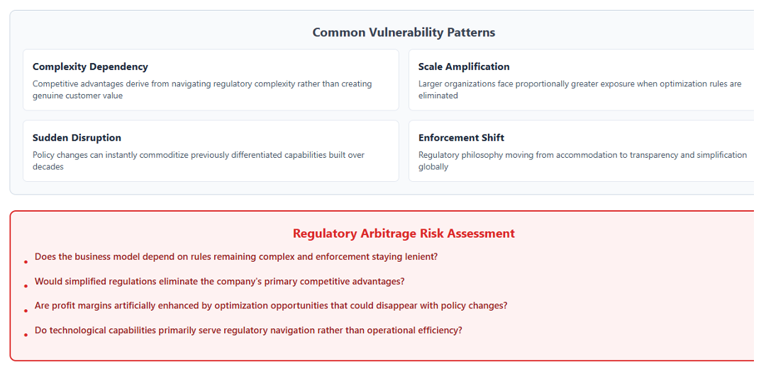 Does the business model depend on rules remaining complex and enforcement staying lenient? Would simplified regulations eliminate the company's primary competitive advantages? Are profit margins artificially enhanced by optimization opportunities that could disappear with policy changes? Do technological capabilities primarily serve regulatory navigation rather than operational efficiency?