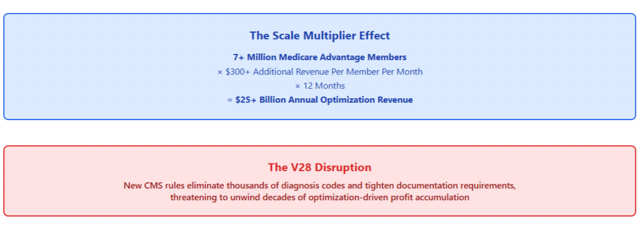 The scale effects were profound. Larger organizations could afford more sophisticated coding infrastructure, better training programs, and deeper analytics capabilities. UnitedHealth's size became a regulatory optimization platform, systematically extracting value from Medicare's complexity faster than smaller competitors could match.