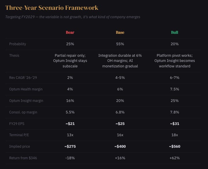 The bear case is not disaster, it is partial repair that disappoints. Pricing helps but not enough. Optum Health stalls in the mid-single digits. The workflow pivot stays aspirational. The market concludes UNH is a good business, permanently less good.