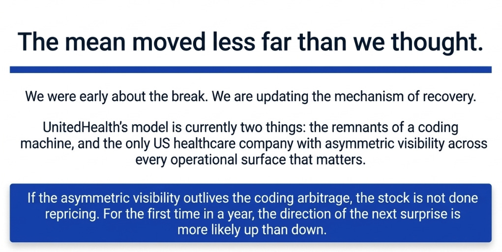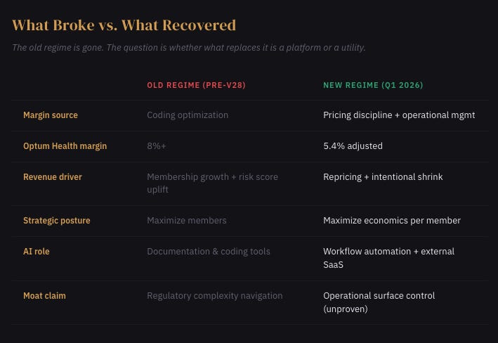 The break was real, but so was the recovery. We were right that V28 permanently impaired the old Optum model, yet 1Q26 showed enough operational improvement to suggest there was something real underneath the coding layer.