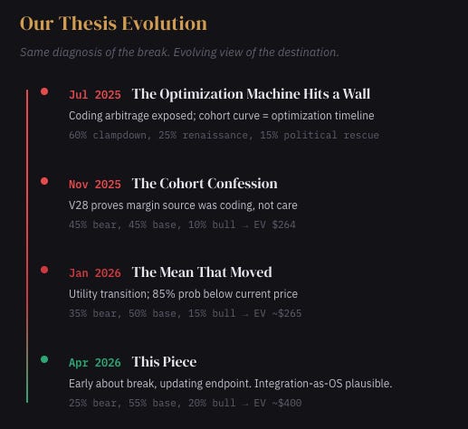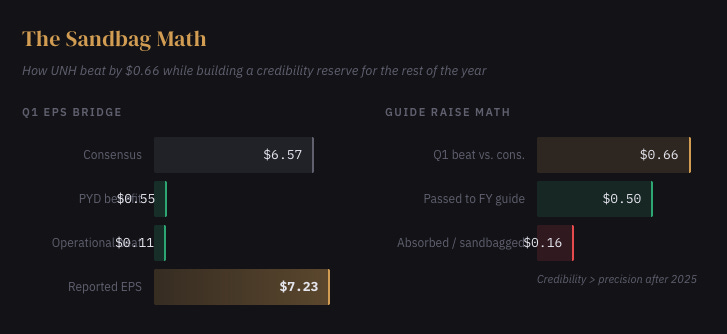 Where we need to update is the destination. We argued UnitedHealth was becoming a utility. Q1 suggests something more interesting might be happening, and the difference between “utility” and “something more interesting” is worth roughly $150 of stock price.