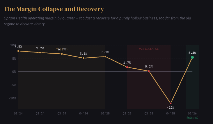 Consider what happened in Q1. Optum Health posted $1.3 billion of adjusted operating earnings at a 5.4% margin, a recovery of more than 500 basis points from Q4 in a single quarter. If the entire business had been coding optimization in a trench coat, that speed of recovery is difficult to explain. You cannot operationally fix a segment that was structurally hollow. You can only fix one that had real capabilities buried underneath a layer of arbitrage.