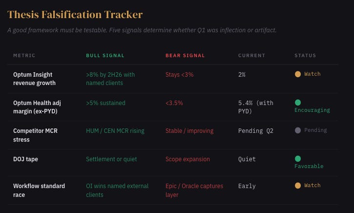 Optum Insight revenue growth must inflect toward 8%+ by late 2026 with identifiable external customer wins, not pipeline commentary, revenue. Optum Health adjusted margin must sustain above 5% in Q2 without reserve help. Competitor earnings, Humana, Centene, CVS, must show MCR stress from absorbing the MA members UNH shed, confirming that intentional shrink was asymmetrically damaging. The DOJ tape must remain quiet; any structural-remedy signal invalidates the integration thesis entirely. And the workflow standard race matters: if Epic, Oracle Health, or a well-funded startup captures the provider operating layer before Optum Insight scales, the platform thesis dies regardless of how good UNH’s internal metrics look.
