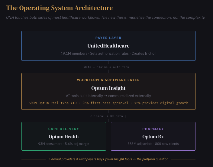 UnitedHealth occupies an unusual structural position: it touches more high-friction surfaces in healthcare than any other company. UnitedHealthcare sees the authorization demand. Optum Health sees the clinical fulfillment. Optum Rx sees the prescription. Optum Insight builds the software connecting all three. No other company has this degree of asymmetric visibility across both sides of the core healthcare workflows, claims, prior authorization, care navigation, scheduling, provider engagement, member experience.