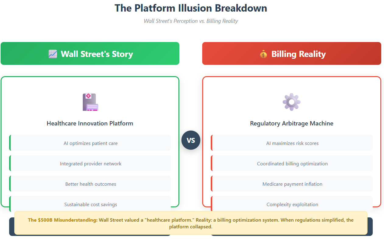 Platform Illusion Shattered: The vaunted "healthcare platform" was really a billing machine—now obsolete in a world demanding transparency, not tricks.
