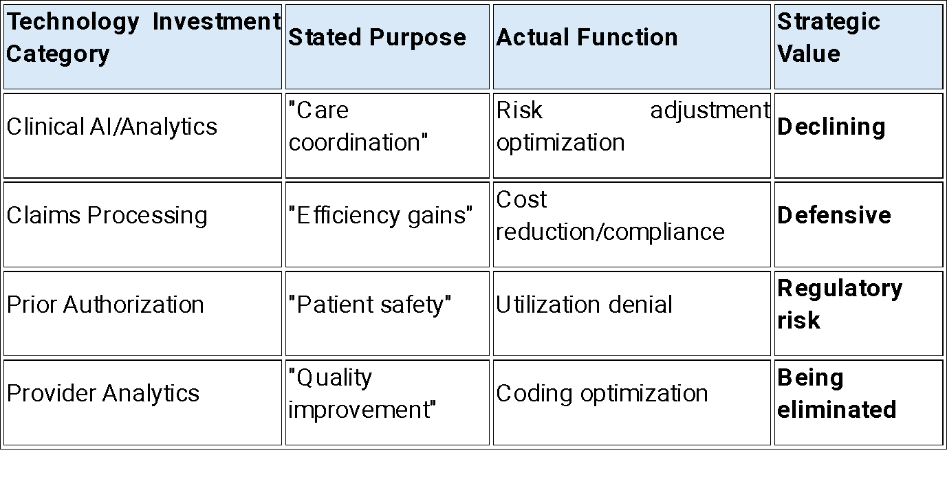 This is billing optimization infrastructure being repurposed for cost management and regulatory defense, not genuine healthcare innovation. The telling absence: no specific examples of AI improving clinical outcomes or patient engagement independent of reimbursement optimization.