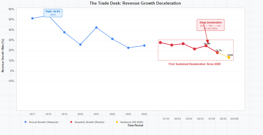 The Trend: The growth trajectory is now unambiguously decelerating: +25% (Q1) → +19% (Q2) → +14% (Q3 Guide).
