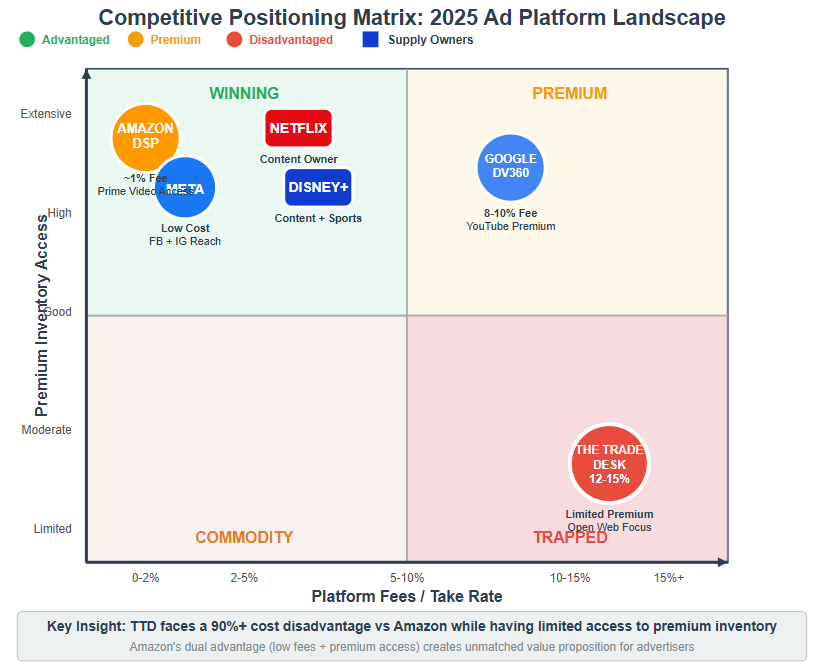 Access (The Sovereignty of Supply): The most valuable, attention-grabbing content—live sports, flagship streaming shows, cultural moments—is increasingly consolidated within closed ecosystems. The NFL on Prime Video, the NBA on multiple platforms, top-tier shows on Netflix and Disney+; this is the advertising real estate with the highest value. The Trade Desk is the undisputed king of the open internet, but its ability to programmatically buy inventory in these premium “gated communities” is limited. Technology is irrelevant if you don't have access to what clients want to buy most.