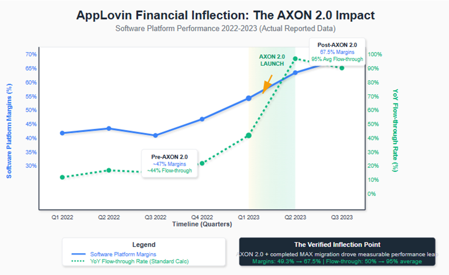 2023 marked a clear inflection point. AppLovin launched AXON 2.0, describing it as a fundamental upgrade to their optimization capabilities. The timing coincided with completed MAX migration and scaled auction data visibility, producing immediate results: software platform margins expanded from approximately 50% to 67% within quarters, with revenue flow-through rates exceeding 100% during certain periods.