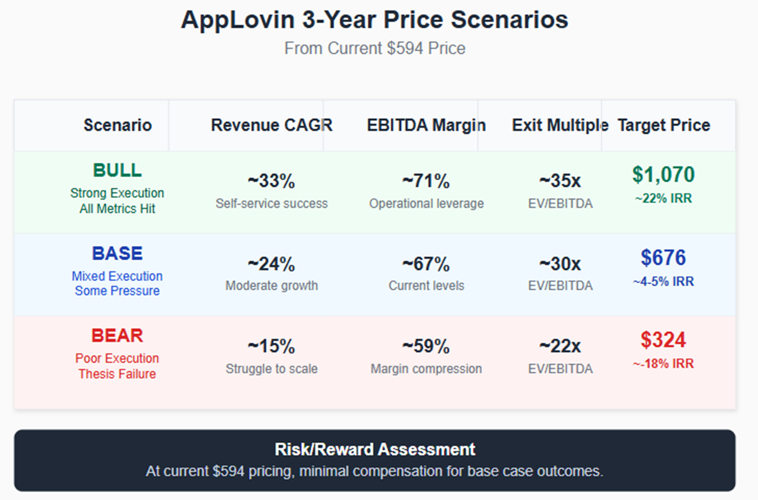 AppLovin's clear strategic timeline and measurable execution milestones enable concrete scenario analysis. Starting from today's $594 price with approximately $5.7 billion trailing revenue and 60% EBITDA margins, three distinct paths emerge: