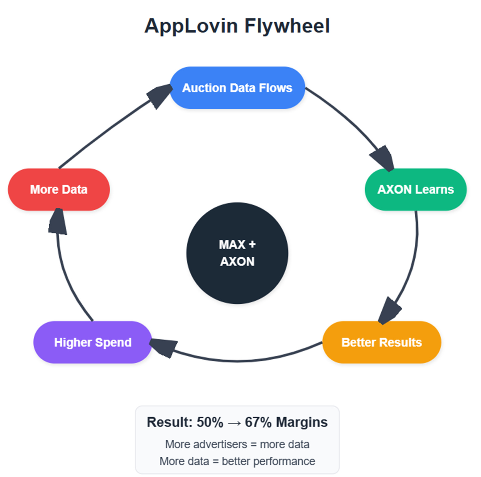 By owning the mediation layer (MAX), AppLovin rebuilt a proprietary data stream powering AXON’s optimization engine—fueling better ad performance and margins.