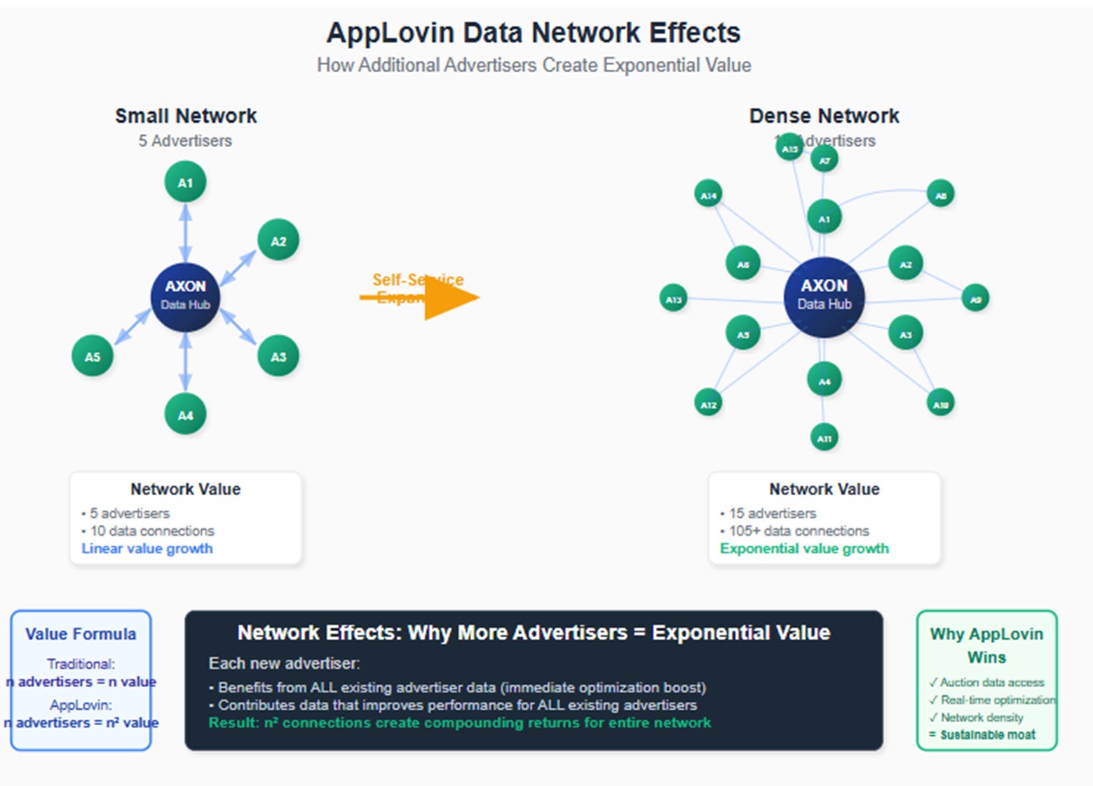 Traditional enterprise software companies approach self-service cautiously, concerned that lower-touch offerings might cannibalize higher-margin managed services. AppLovin confronts the opposite dynamic: additional advertisers using the platform generate superior data, which improves performance for all participants, which attracts increased spending across the entire ecosystem.