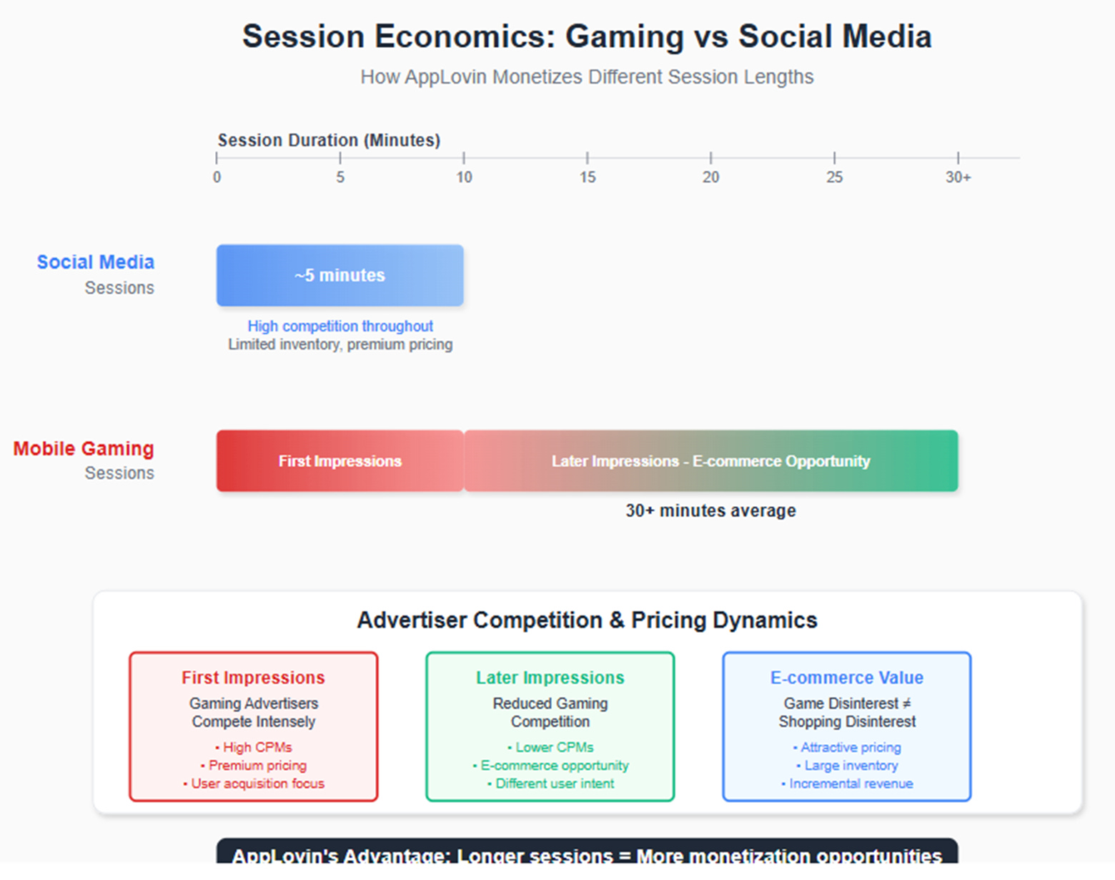 This expansion also leverages session economics that become important beyond gaming. Mobile gaming sessions average over 30 minutes—significantly longer than social media interactions. First impressions in these sessions command premium pricing as gaming advertisers compete intensively for user acquisition opportunities. Subsequent impressions face reduced competition, since users unresponsive to initial gaming advertisements remain unlikely to respond to additional gaming content.