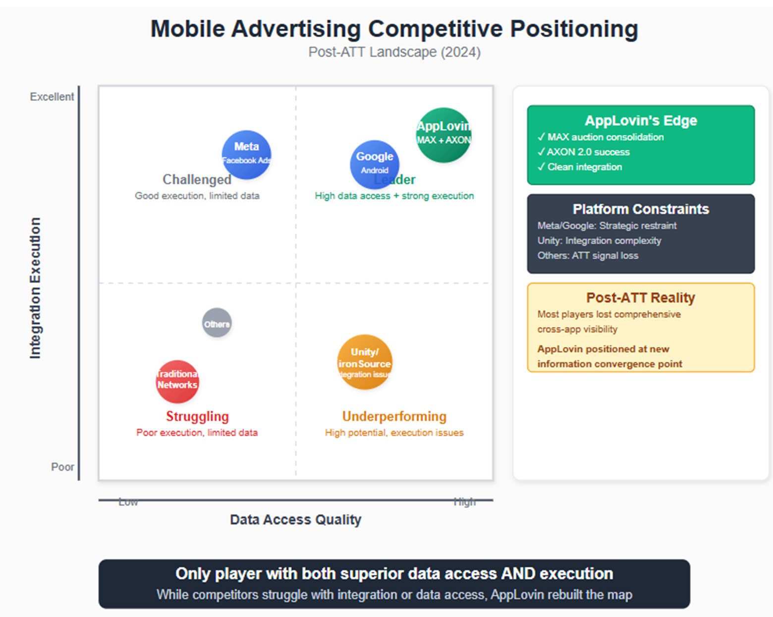 By consolidating the market's largest supply-side platform onto their own infrastructure, AppLovin positioned themselves at the mobile advertising industry's primary switchboard. This created something valuable that ATT had destroyed elsewhere: comprehensive visibility into supply and demand equilibrium across thousands of applications.
