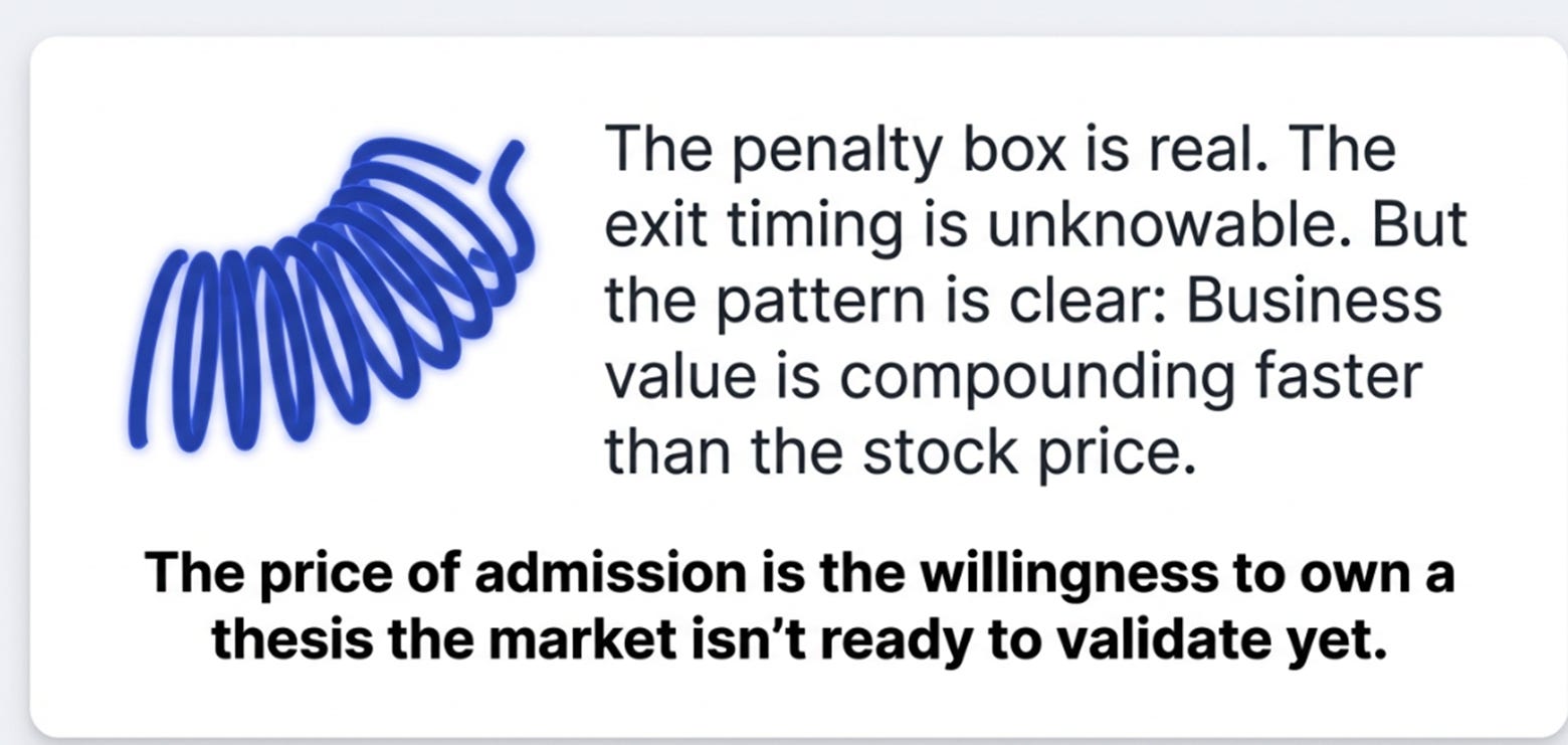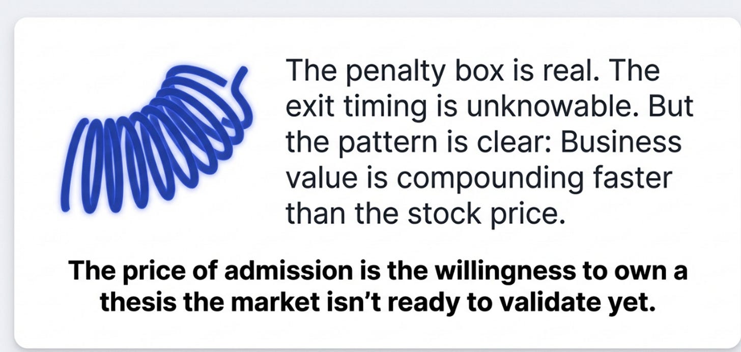 The penalty box is real. The pain is real. The timing is unknowable. But the pattern is identifiable: the business has strengthened faster than the stock has appreciated, but not yet fast enough to force a regime change. Q2 moves this closer to “early” than “wrong.”