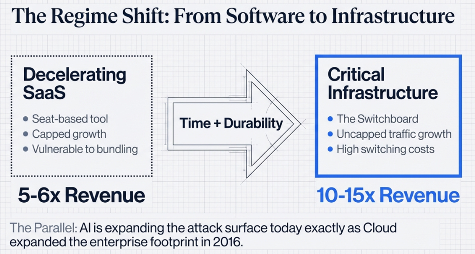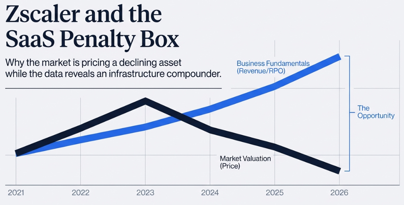 I bring this up because the parallel to Zscaler today is striking. AI is expanding the enterprise attack surface the same way cloud expanded the enterprise footprint a decade ago. The fear that “AI replaces security” is equivalent to the fear that “cloud replaces enterprise software”, directionally wrong, but correct in the sense that the architecture changes. Zscaler is betting that its inline switchboard architecture is the right one for the AI era, just as it was the right one for the cloud era. The stock is priced as if growth is structurally capped and architectural risk is rising.