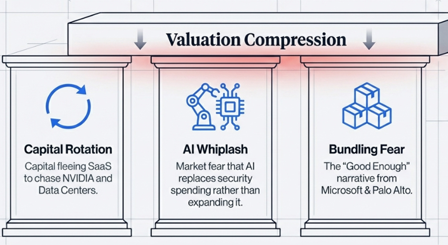 Three forces are compressing the cybersecurity cohort specifically. First, AI narrative whiplash, every new AI capability (Anthropic’s security tools on February 23, Microsoft Copilot features) triggers a reflexive selloff, conflating “AI changes security architecture” (true) with “AI replaces security spending” (false). Zscaler fell 11% on February 23 alone, three days before earnings, on an announcement that had nothing to do with inline enforcement. Second, capital rotation. These are portfolio rebalancing decisions, not fundamental calls. Third, the “good enough” bundling fear, Microsoft is packaging security into E5 licenses, Palo Alto is pitching SASE consolidation. The narrative, not yet the reality, is that baseline security becomes table stakes, commoditizing the low end of what Zscaler sells.