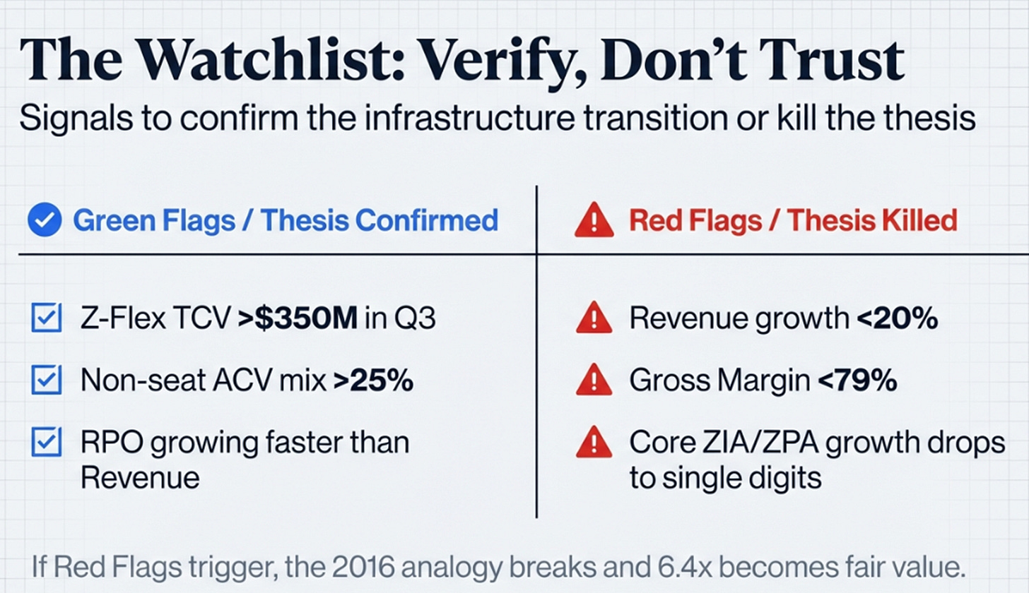 Revenue growth drifting below 20% without a clear seasonal explanation. RPO growth decelerating to match revenue, which would mean the backlog is being consumed, not built. Z-Flex penetration stalling at 30% of bookings for two or more consecutive quarters. Non-seat ACV mix falling back below 20%. Gross margins compressing below 79% from hardware cost inflation that management flagged proactively this quarter. Or core ZIA/ZPA growth dropping from mid-teens to single digits, the one signal that would indicate genuine competitive displacement.