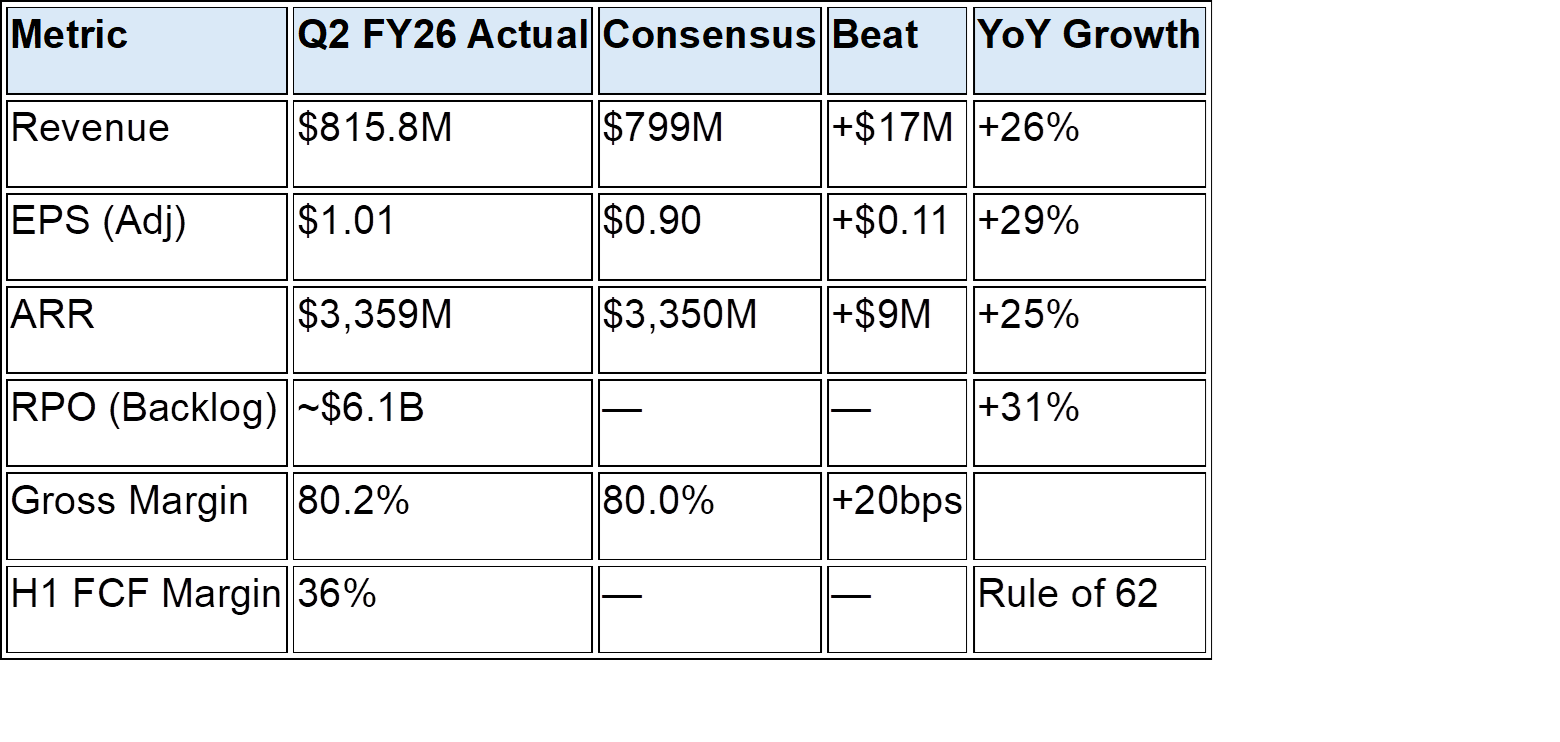 That is a clean beat across every line. Revenue growth re-accelerated from 21% in Q4 FY25 to 26% in both Q1 and Q2, a genuinely rare inflection for a $3B+ ARR company. So why the 10% haircut?