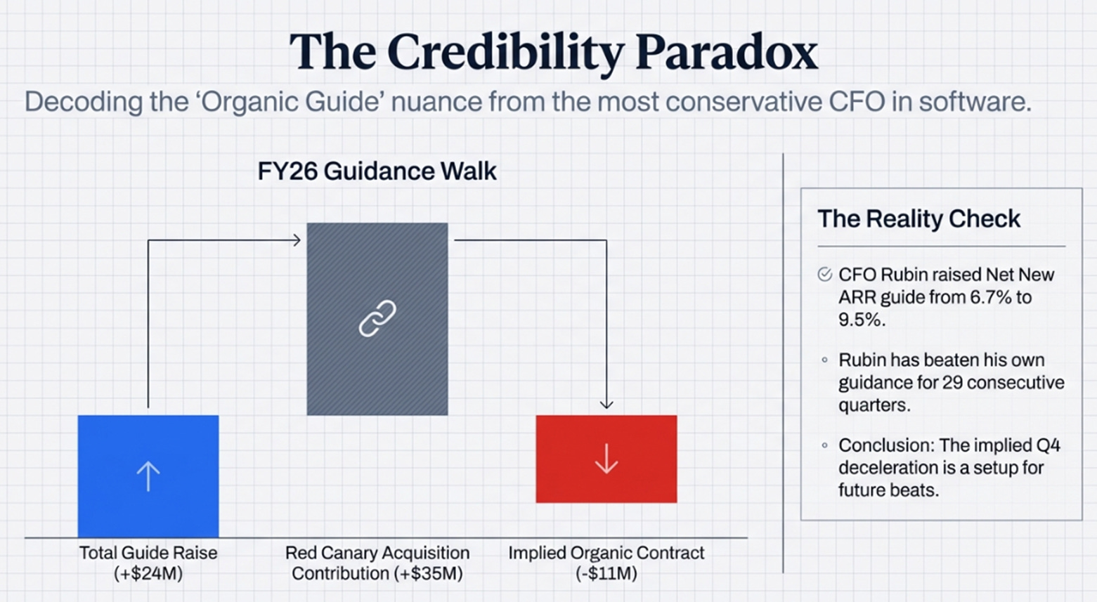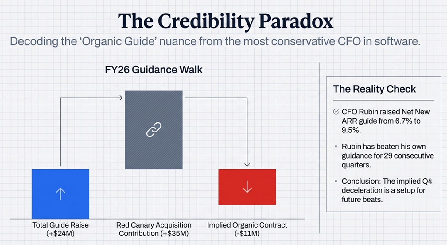 Rubin provided air cover, noting that organic net new ARR growth guidance was actually raised from 6.7% to 9.5% for FY26, a real improvement. He also flagged that Red Canary’s post-acquisition churn has been “elevated.” Both statements are true. But by the time this nuance landed, 45 minutes into the call, the stock was already down 8%. The fast-money accounts had done the subtraction, hit sell, and moved on.