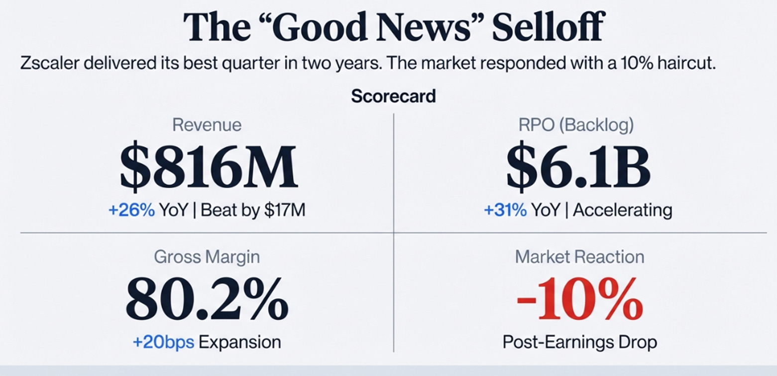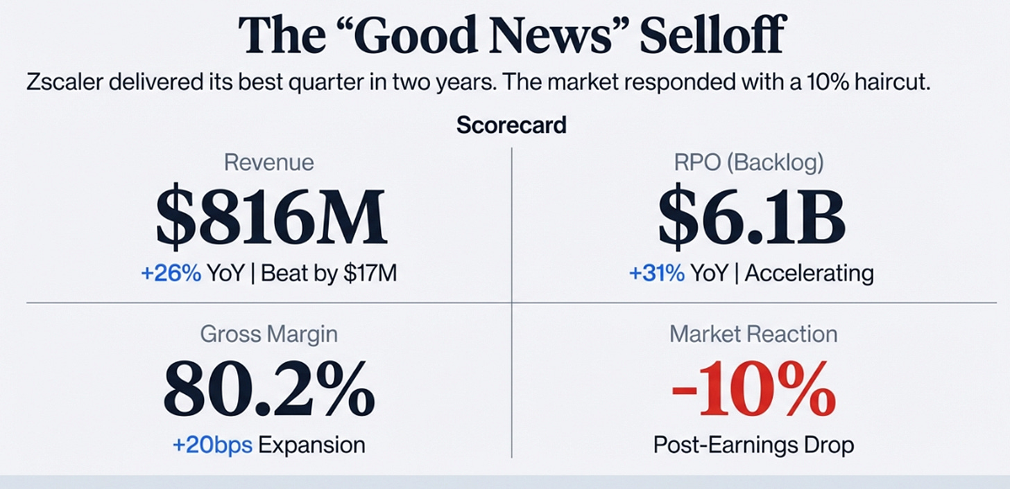 Zscaler delivered its strongest quarter in two years (26% growth, Rule of 62), but shares fell ~10% as investors fixated on organic guide math.