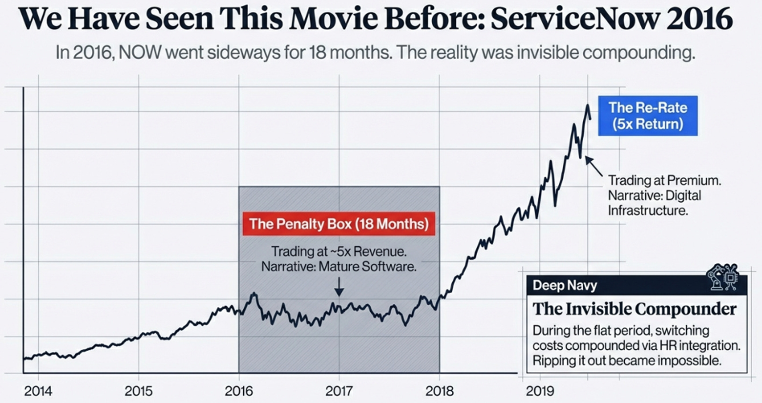 In 2016, ServiceNow went sideways for 18 months while the business compounded underneath. The re-rate came not from a single catalyst quarter, but from the market gradually recognizing that switching costs had made the business more durable than the multiple implied. By the time the stock reflected the reality, the easy money had already been made by the investors who bought into the penalty box.